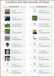 Click on the photo to enlarge the board for June’s leading transcribers and photo collectors (as of 10:10 AM MDT). A special congratulations to Catirrel and trishkovach, who each are currently topping either the photo or the transcription list. And an extra thank you to crex and Hokie374, who both are into the Top 10 for both categories.