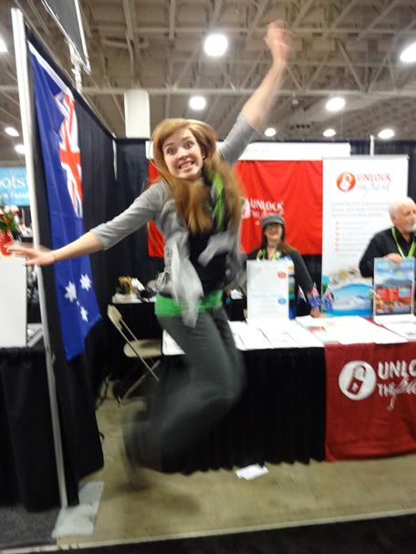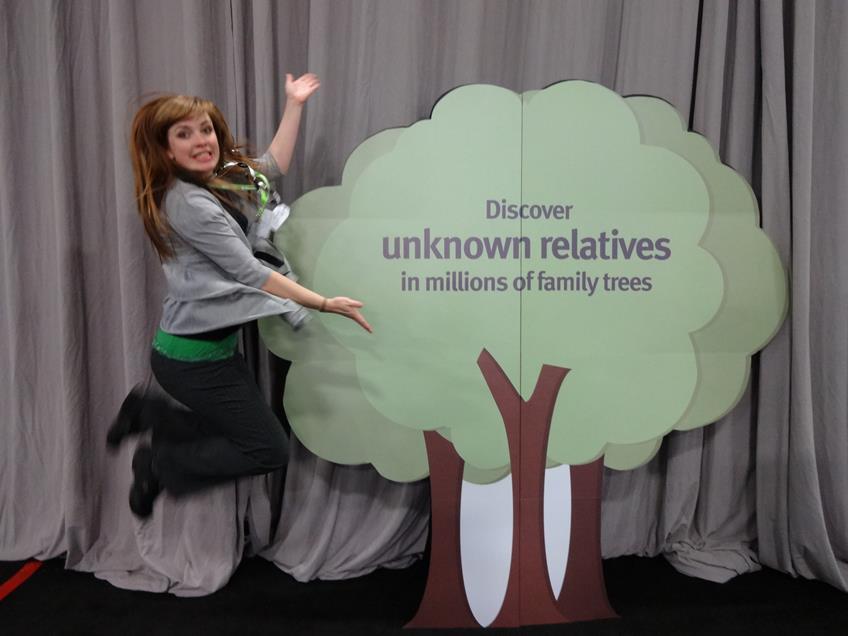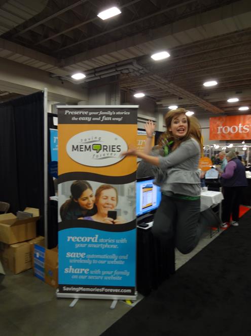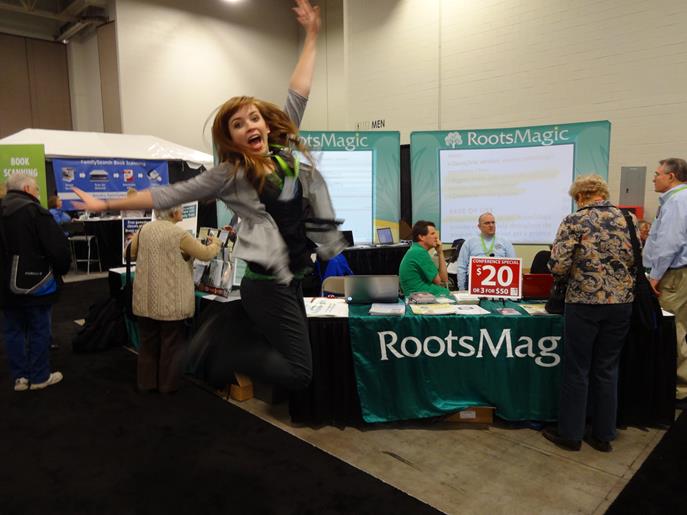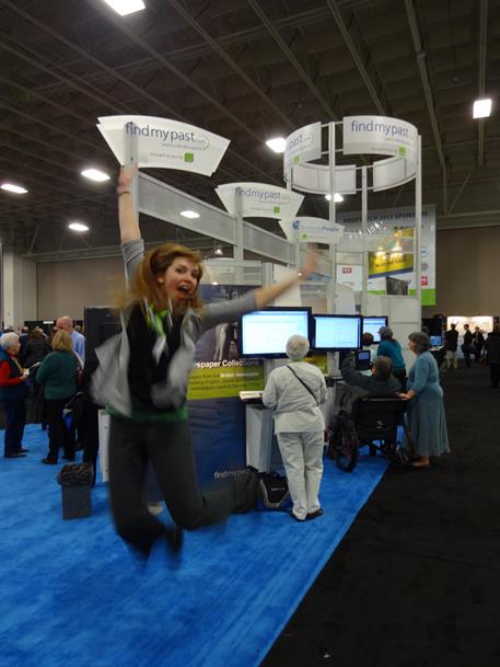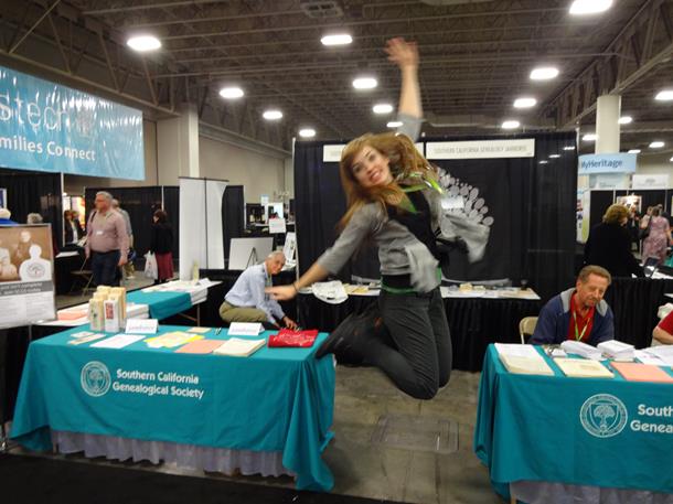 The lovely waterfall/sign that greeted us every morning when we walked into the Expo hall.Gotta love Ancestry.com!Find My Past: their booth was so tall!I LOVED meeting these lovely Aussies (Alona Tester in the hat behind me is a blogger too!) I can’t help being jealous of her lovely accent.These people loved the fact that it looked like they were photo-bombing me, when really, I was sneakily getting the picture of them!I heard lots of great things about RootsMagic this weekend, I may just have to try them out myself!Mocavo provided the green lanyards for ALL conference attendees!MyHeritage has some exciting things coming up! Can’t wait to try out the free 6 month membership I won from them!The My Heritage side-note we got to look at all day (our booth was right next door). I have the gift of levitation everyone.Everyone loves FamilySearch here!Flip-Pal has a ROCKIN’ product. Might just have to rob my piggy bank to get myself one!Saving Memories Forever; I already have their app on my phone!I think these two lovely ladies weren’t sure what to think of me…Yes, folks, this is the only booth that applauded my jumping skills. Thanks Southern California Geneological Society!ReelGenie was packing up their booth by the time I got to theirs… I had to jump real fast!And then I found someone to jump with me! I love these Sistas in Zion! What great sports!…and we ended big with one big BillionGraves JUMP. These guys are the best!